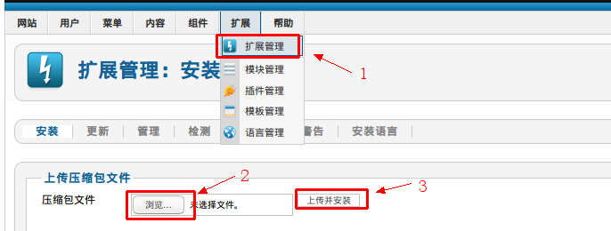2、安裝,進(jìn)入后臺(tái)管理控制臺(tái)-->擴(kuò)展-->擴(kuò)展管理-->瀏覽,選擇剛下載的模塊壓縮包-->上傳并安裝