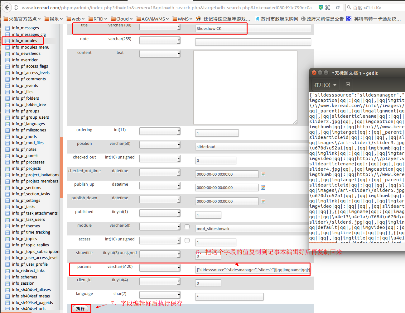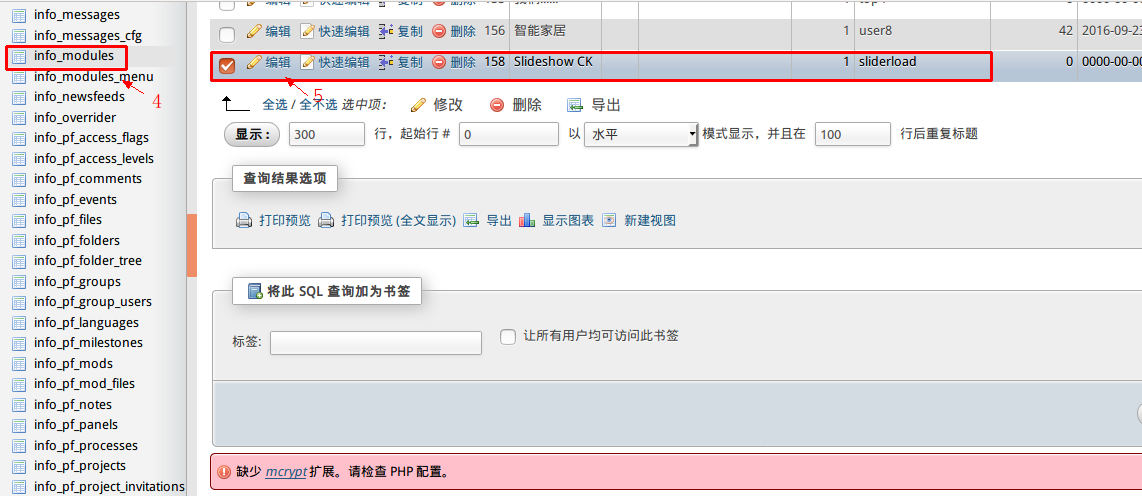 2、找到“你定義的前綴_modules”這個(gè)表,我的表前綴是“info”,所以全例的表是“info_modules”,點(diǎn)編輯