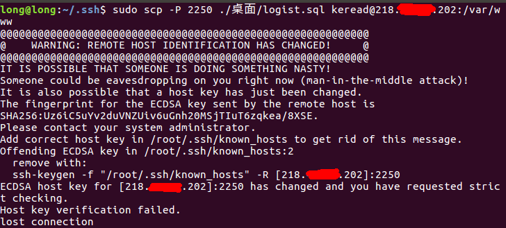 long@long:~/.ssh$ sudo scp -P 2250 ./桌面/logist.sql 該Email地址已收到反垃圾郵件插件保護(hù)。要顯示它您需要在瀏覽器中啟用JavaScript。 :/var/www