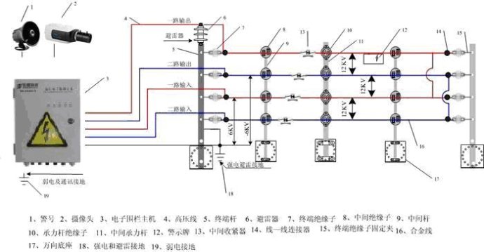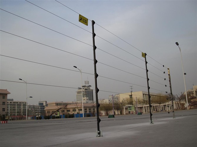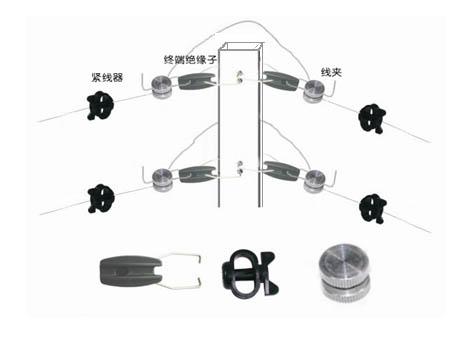 3、每個(gè)拐角處以及防區(qū)的兩端,不大于100米時(shí)或者其他拉力比較大而有必要的位置裝置終端桿,分區(qū)處應(yīng)從兩個(gè)方向安裝絕緣子。